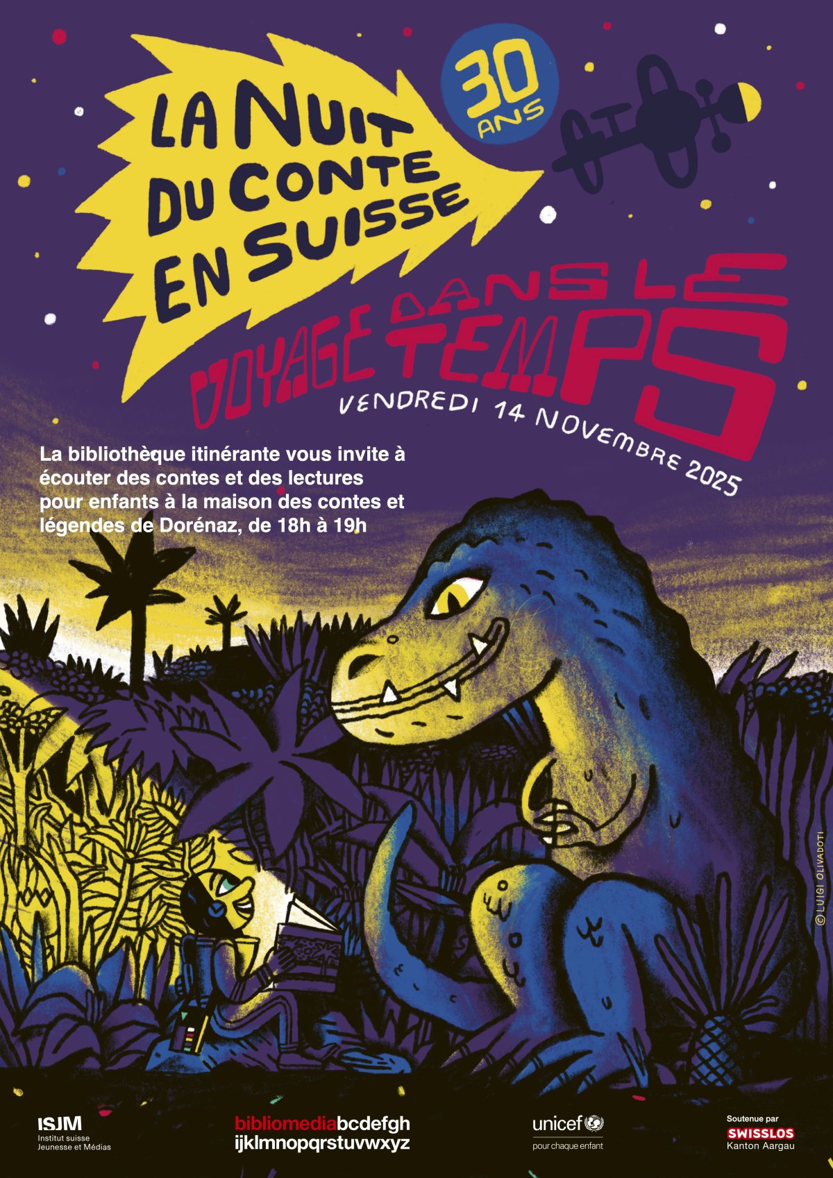 La bibliothèque itinérante vous invite à écouter des contes et des lectures pour enfants à la maison des contes et légendes de Dorénaz, de 18h à 19h le vendredi soir 14 novembre 2025.