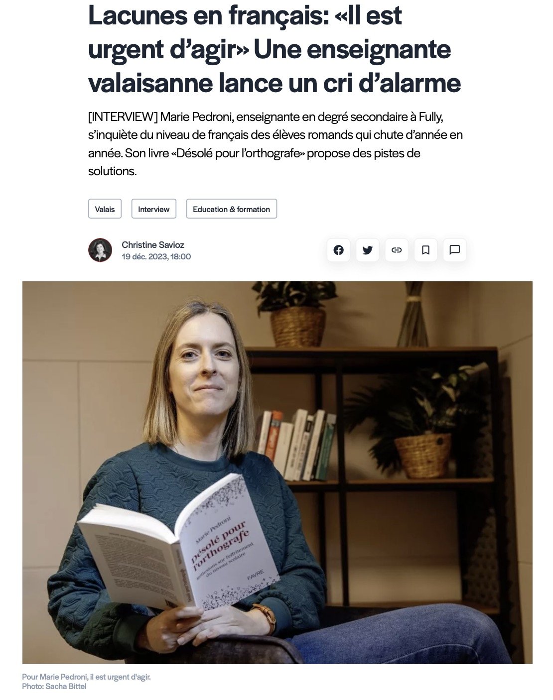 Une enseignante de français a publié un livre, car il est « urgent d'agir » pour augmenter le niveau de français des jeunes élèves...https://www.lenouvelliste.ch/valais/lacunes-en-francais-il-est-urgent-dagir-une-enseignante-valaisanne-lance-un-cri-dalarme-1349861